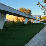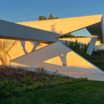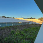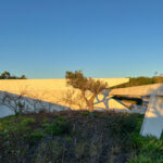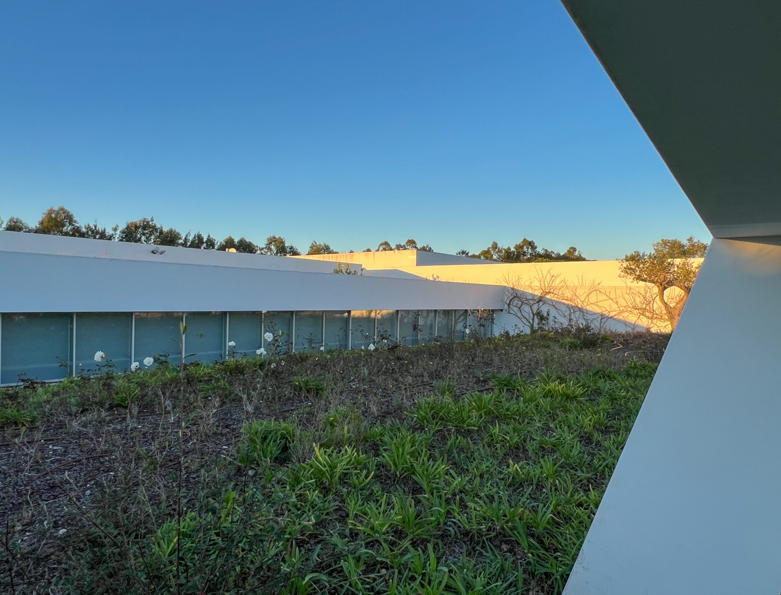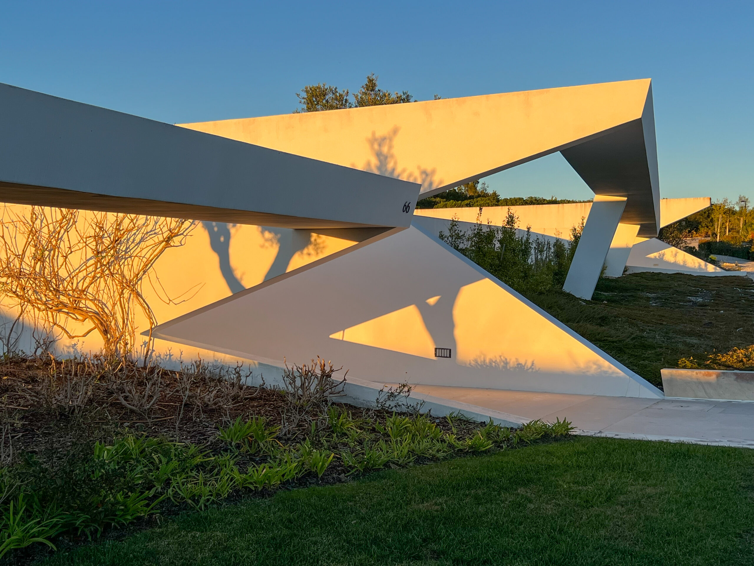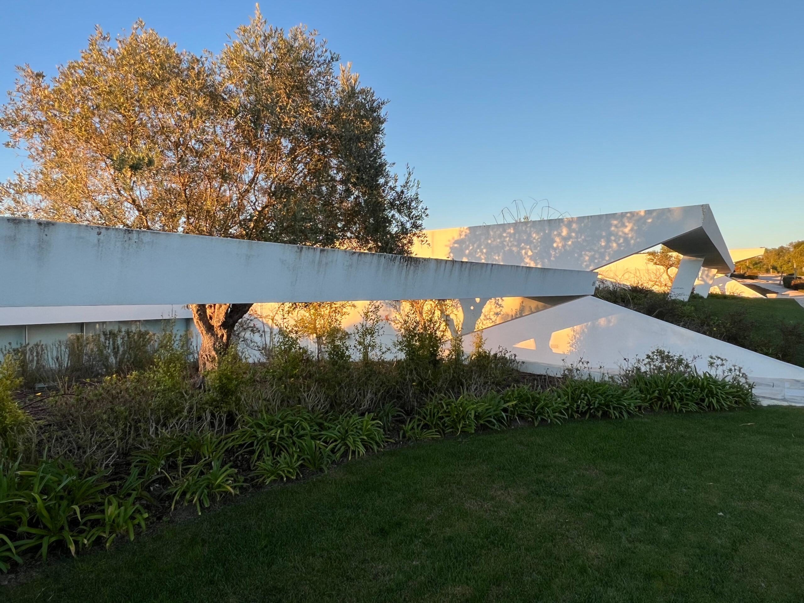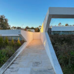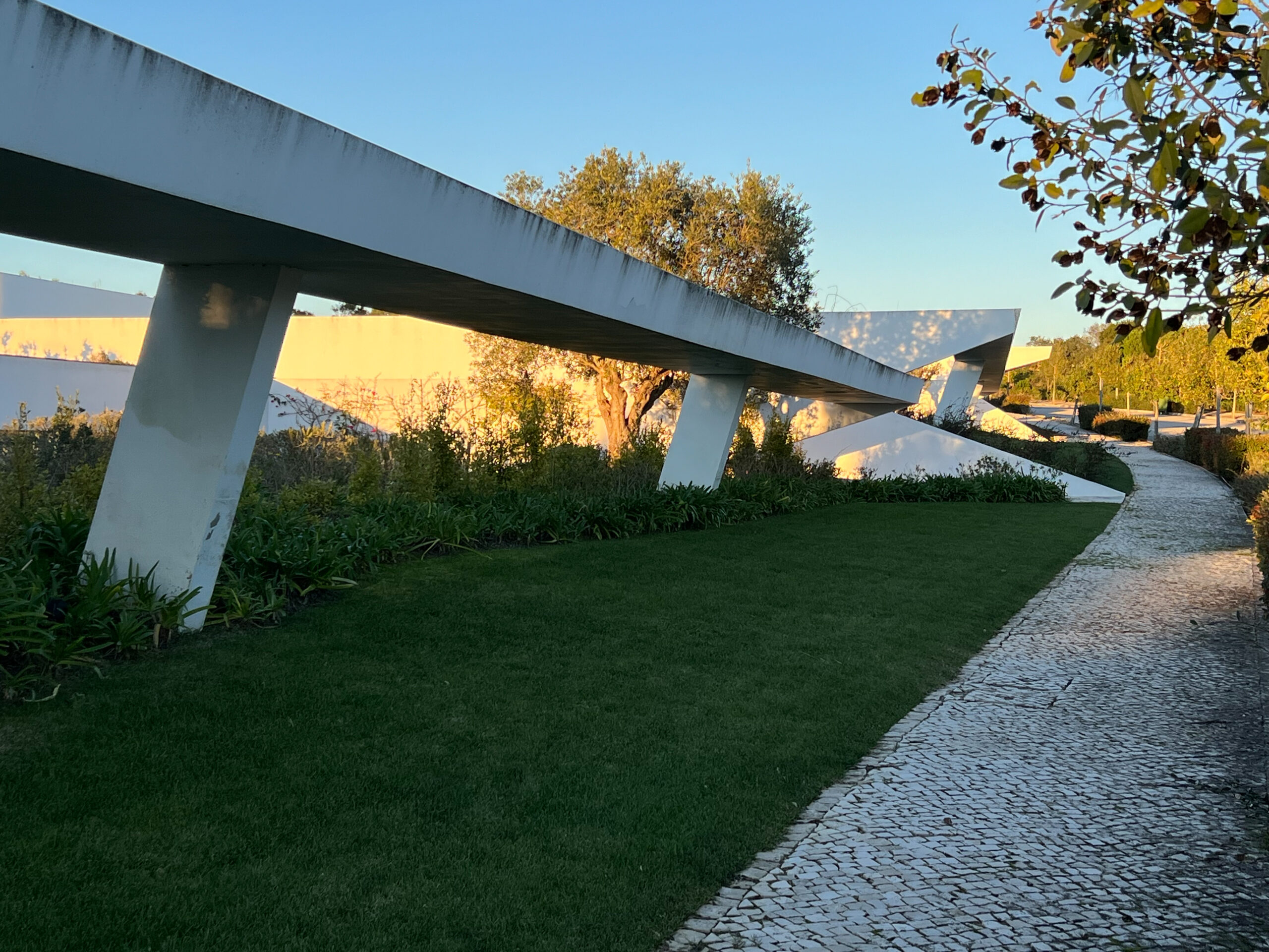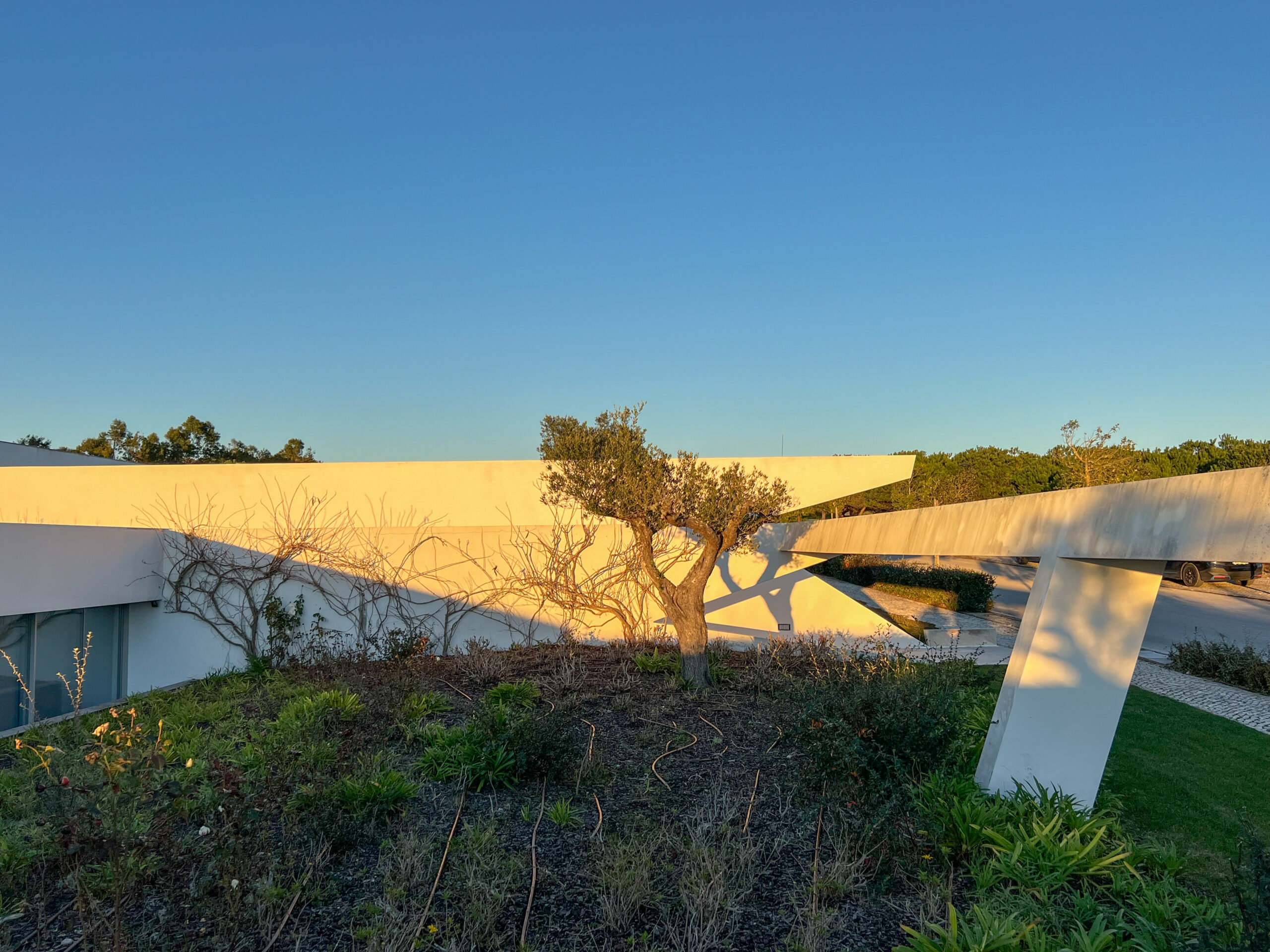 Designed by Gonçalo Byrne, this set of five villas at Bom Sucesso Resort evokes the futuristic aesthetics of a space station, with bold geometric forms and a striking front structure reminiscent of white airplane wings. This unique architectural feature defines the front garden border and frames the surrounding landscape.