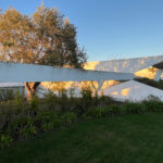 Beyond this transparent living area lies the private garden, which subtly rises into a small hillside, cleverly concealing the garage beneath it. To access the garden and pool, residents cross two bridge-like structures, reinforcing the sense of fluidity and openness. The swimming pool, with its multiple sections, extends across the entire width of the garden, serving as a stunning visual centerpiece.