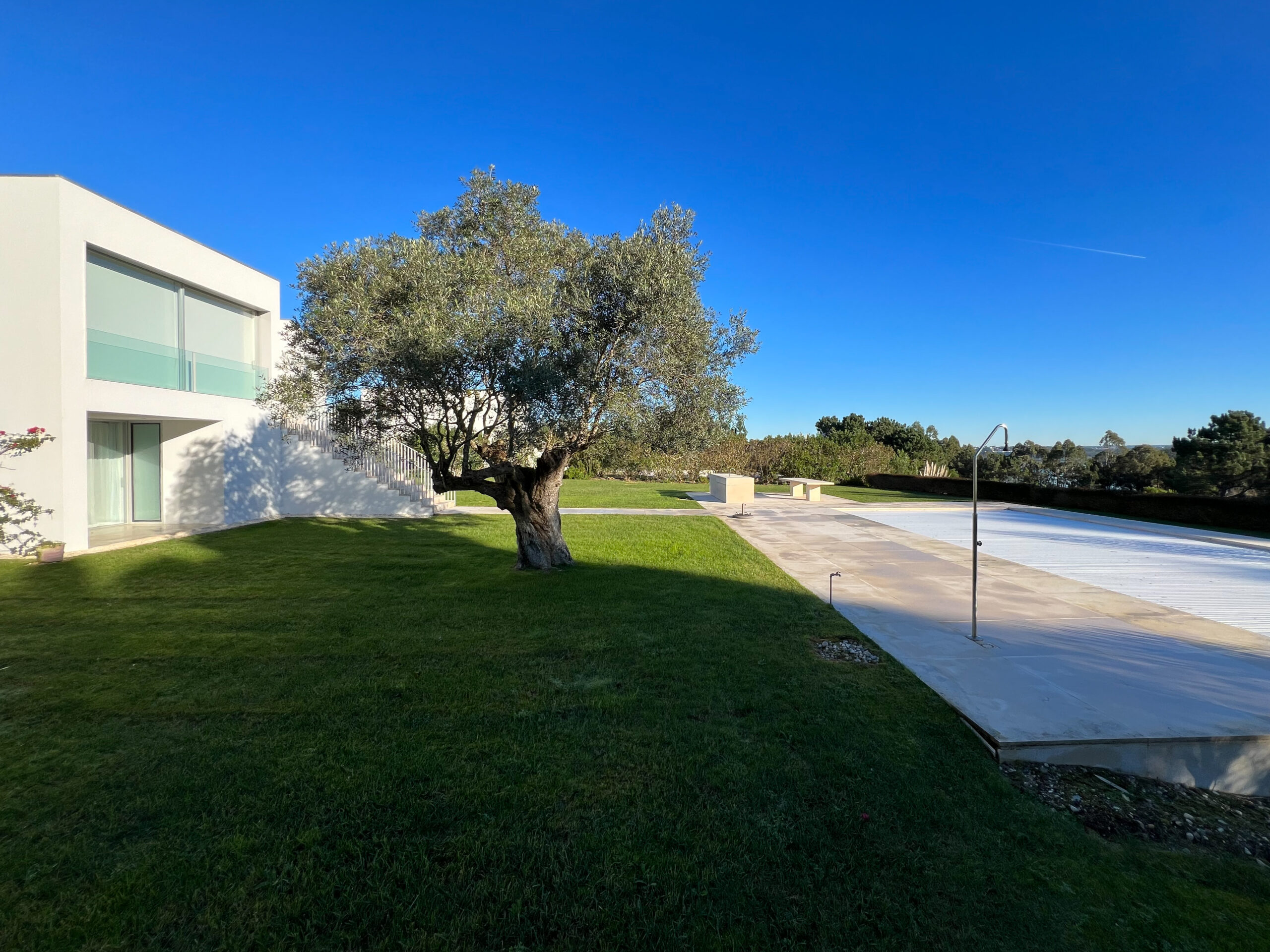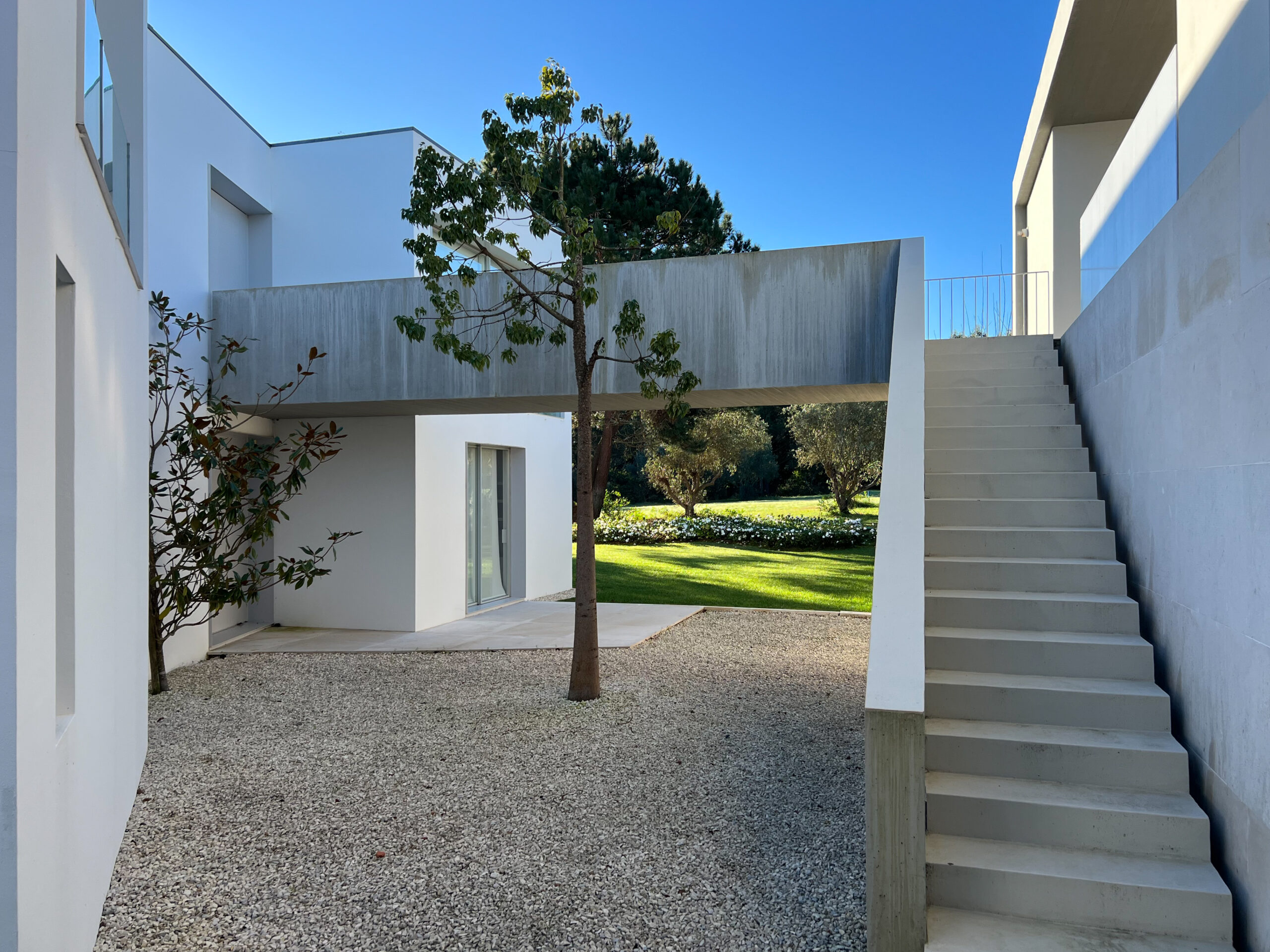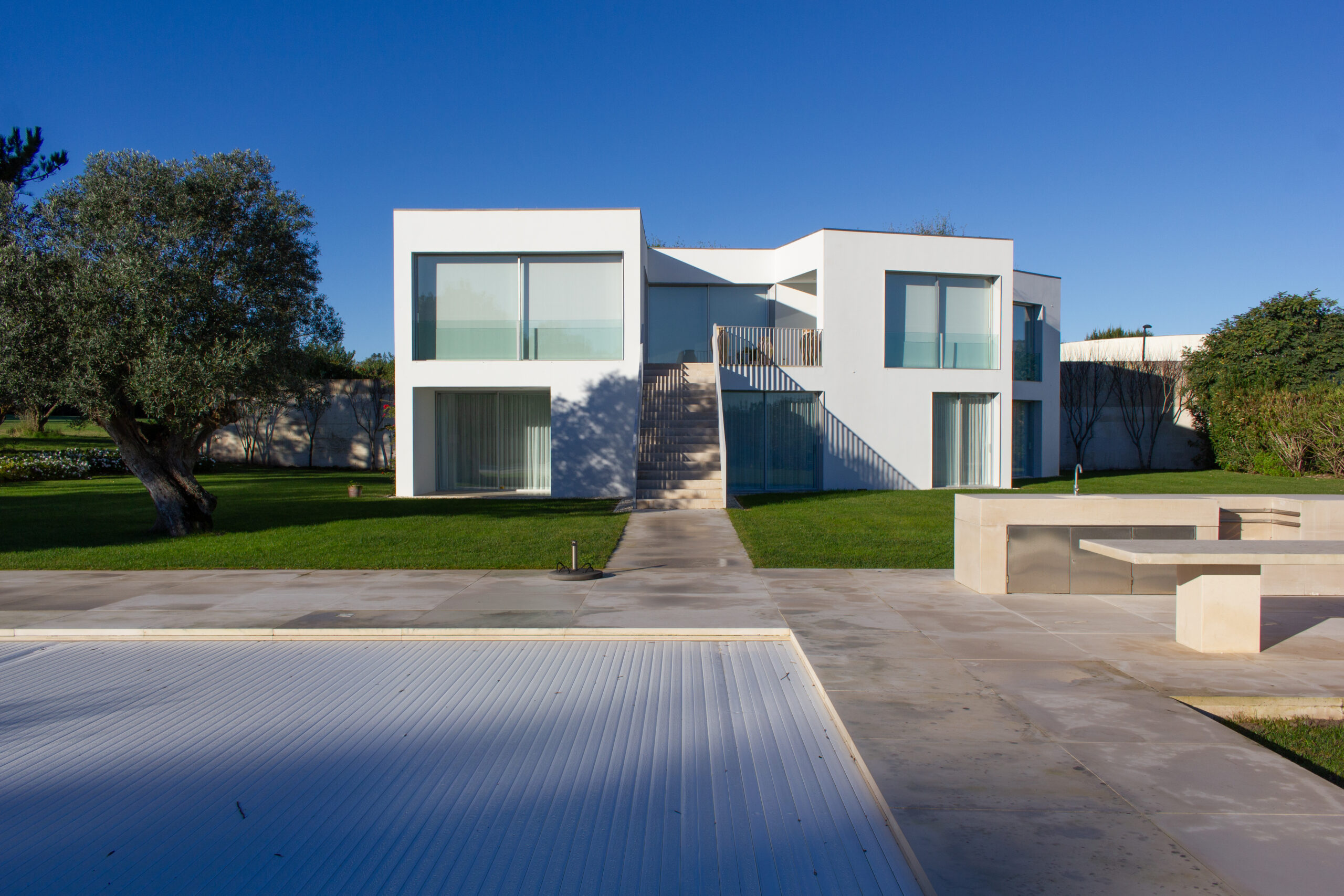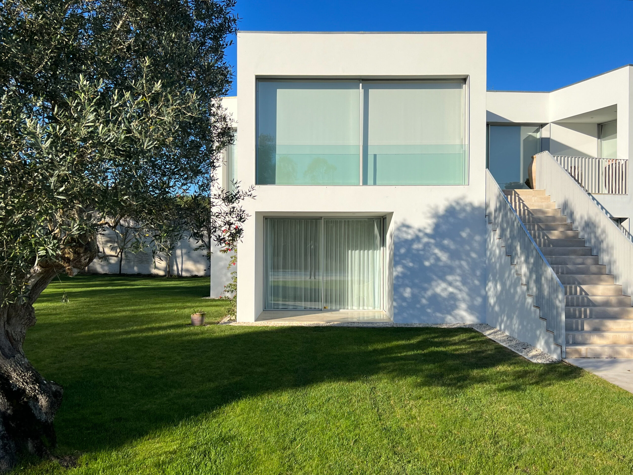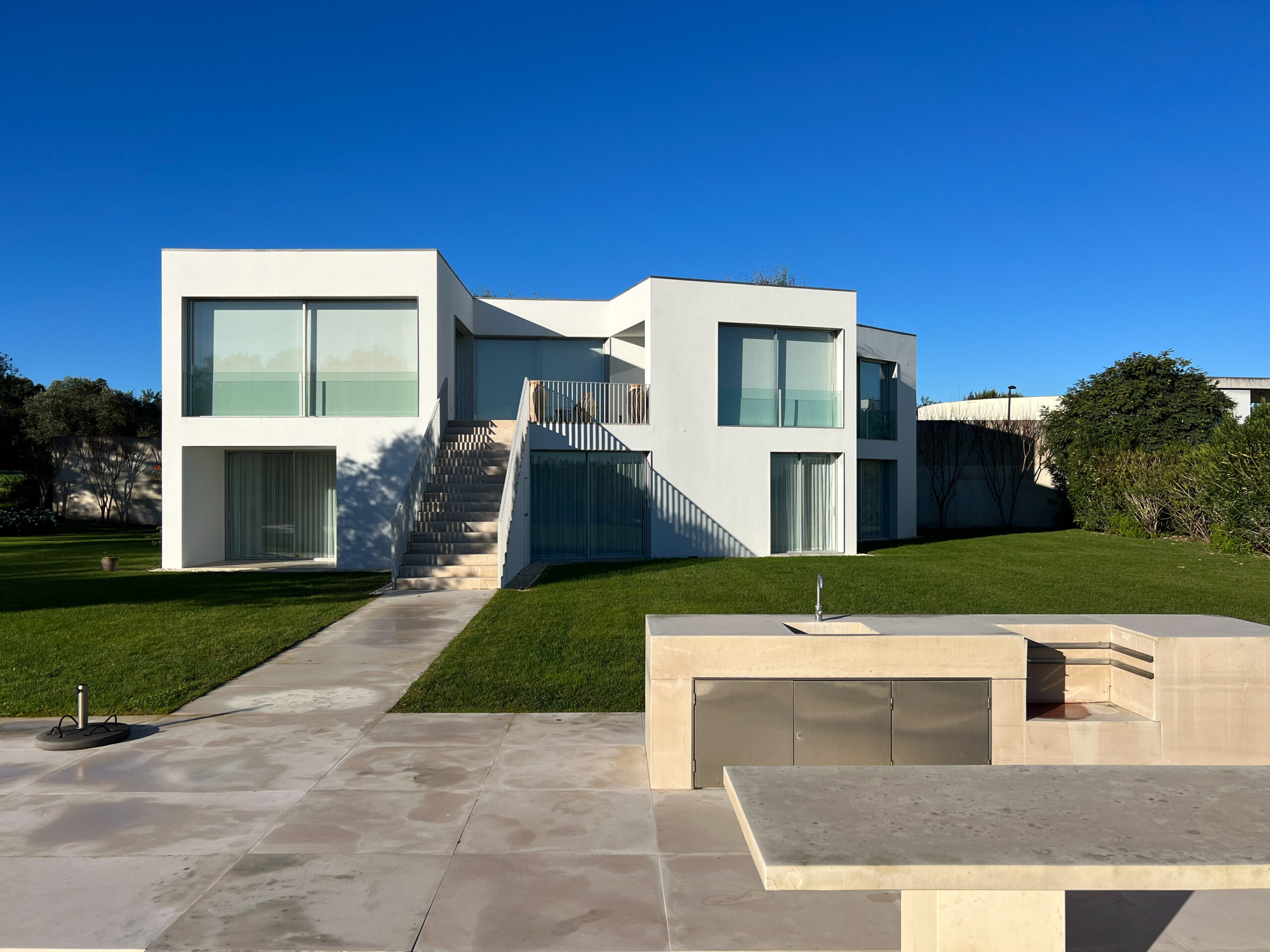“From the entrance hall, you have a direct view of the garden and the Óbidos Lagoon. From here, you enter the dining room, living room, and kitchen. Continuing from the lobby, a wide outdoor staircase leads over the terrace directly into the garden and pool, creating a strong optical connection between house and garden.” – David Chipperfield