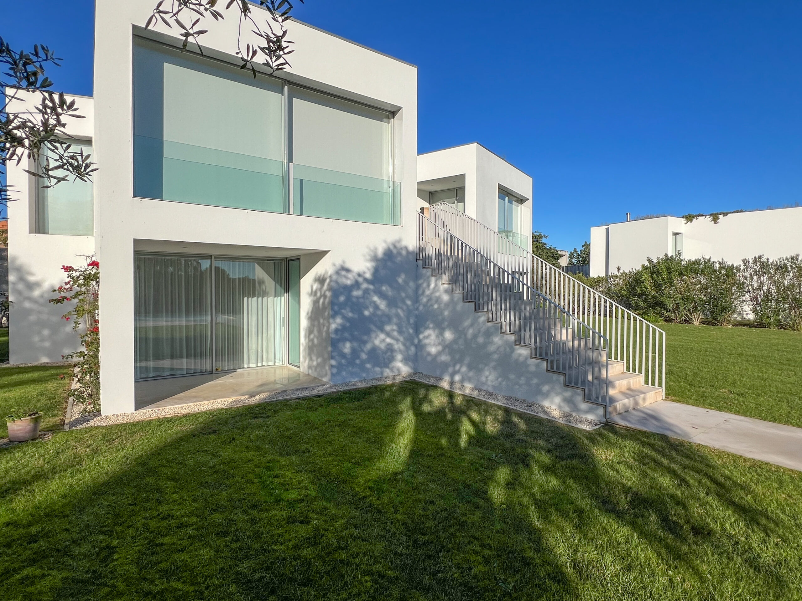 Each villa is spread over two floors, carefully designed to enhance views and privacy. A bridge connects the carport to the upper floor, where the main living areas are located, offering stunning views of the Óbidos Lagoon. The private rooms are positioned on the lower floor, ensuring seclusion and a direct connection to the garden and pool.