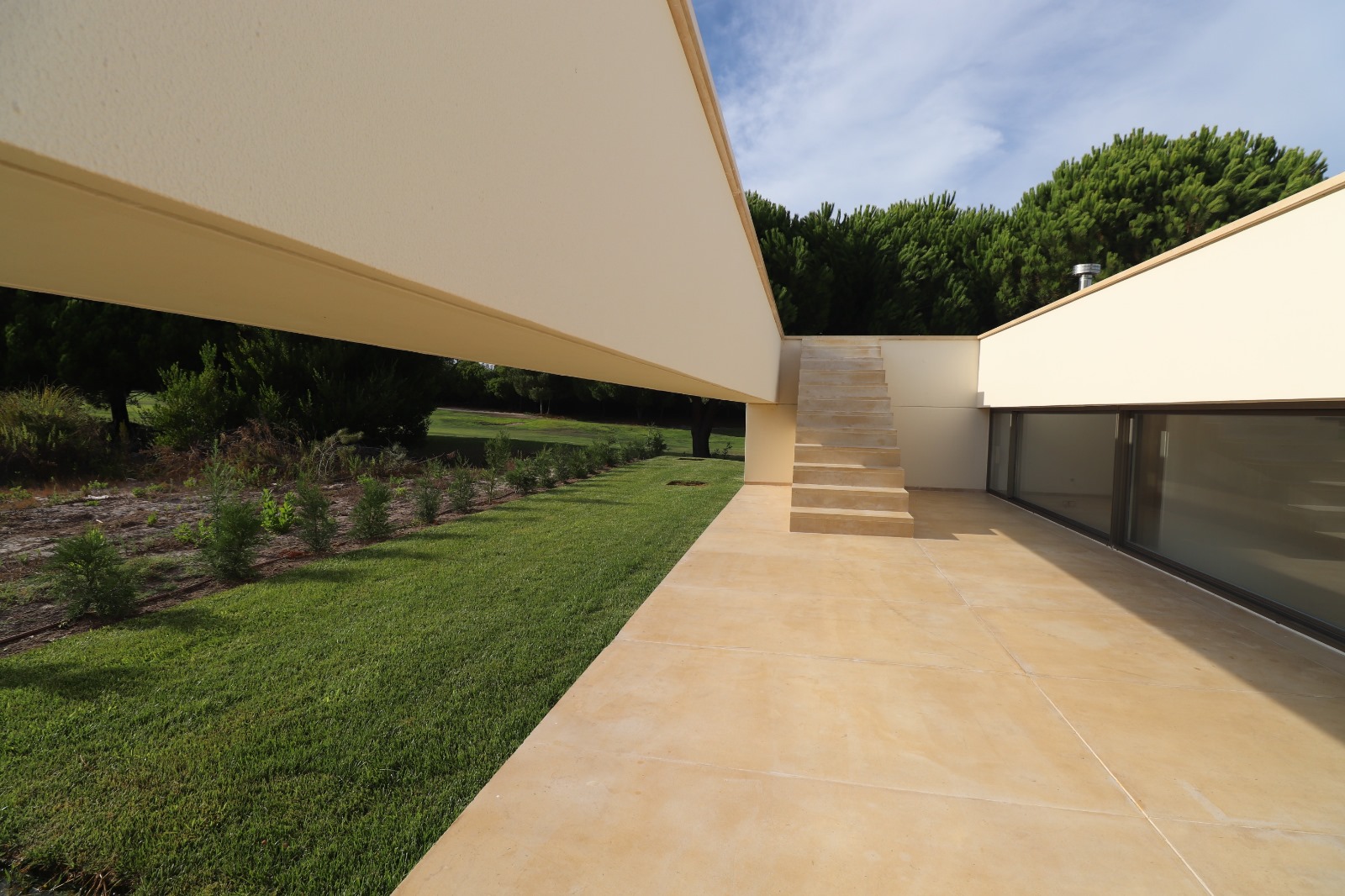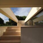 As the architect describes, “Characteristic of this type of construction is the successful interplay of living spaces and functional areas, which are covered by a roof garden in the form of a large planted stone slab, despite the separation. The patios in front of the bedrooms provide access to the roof garden.”