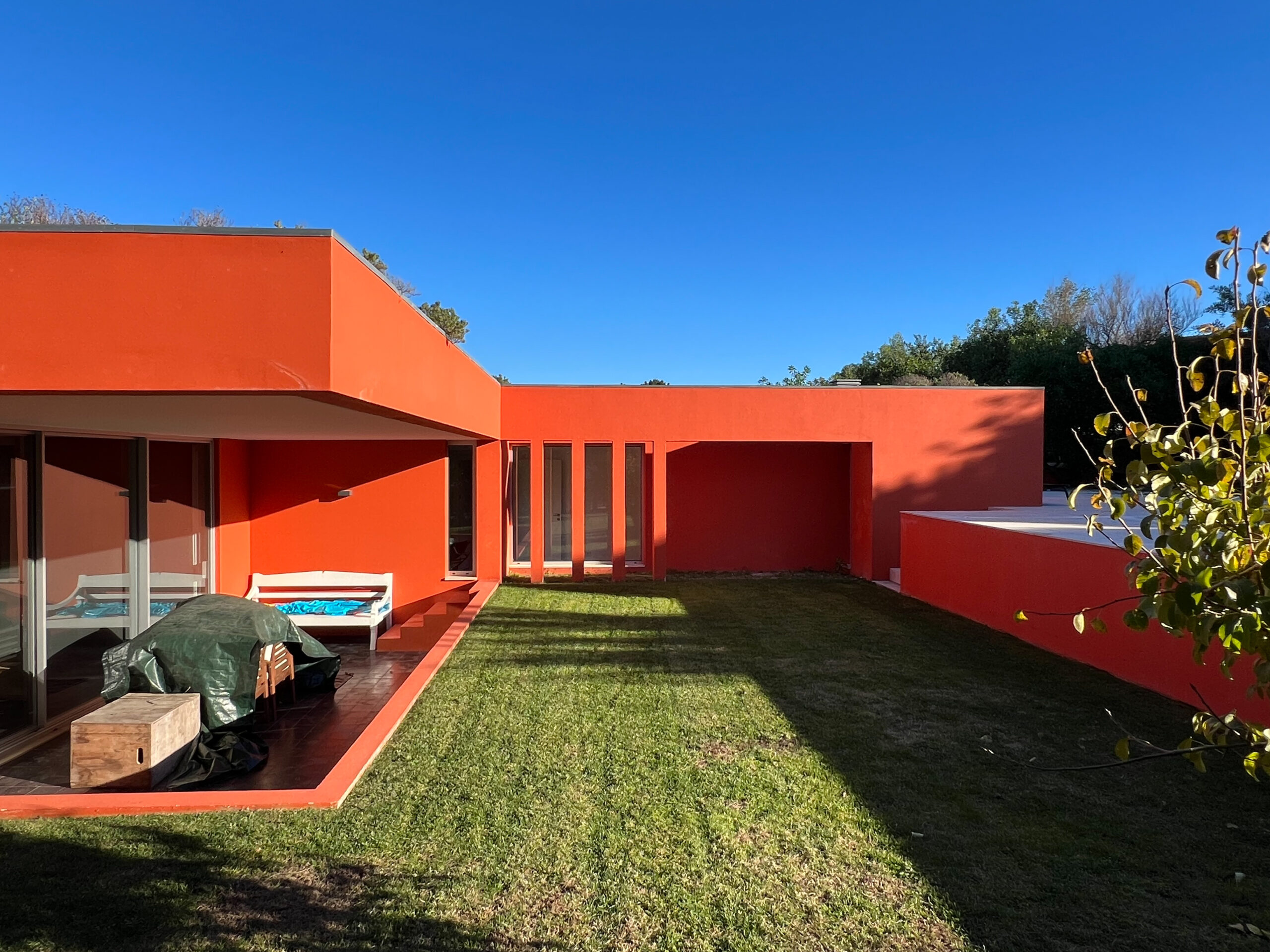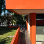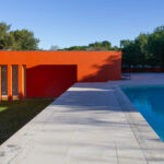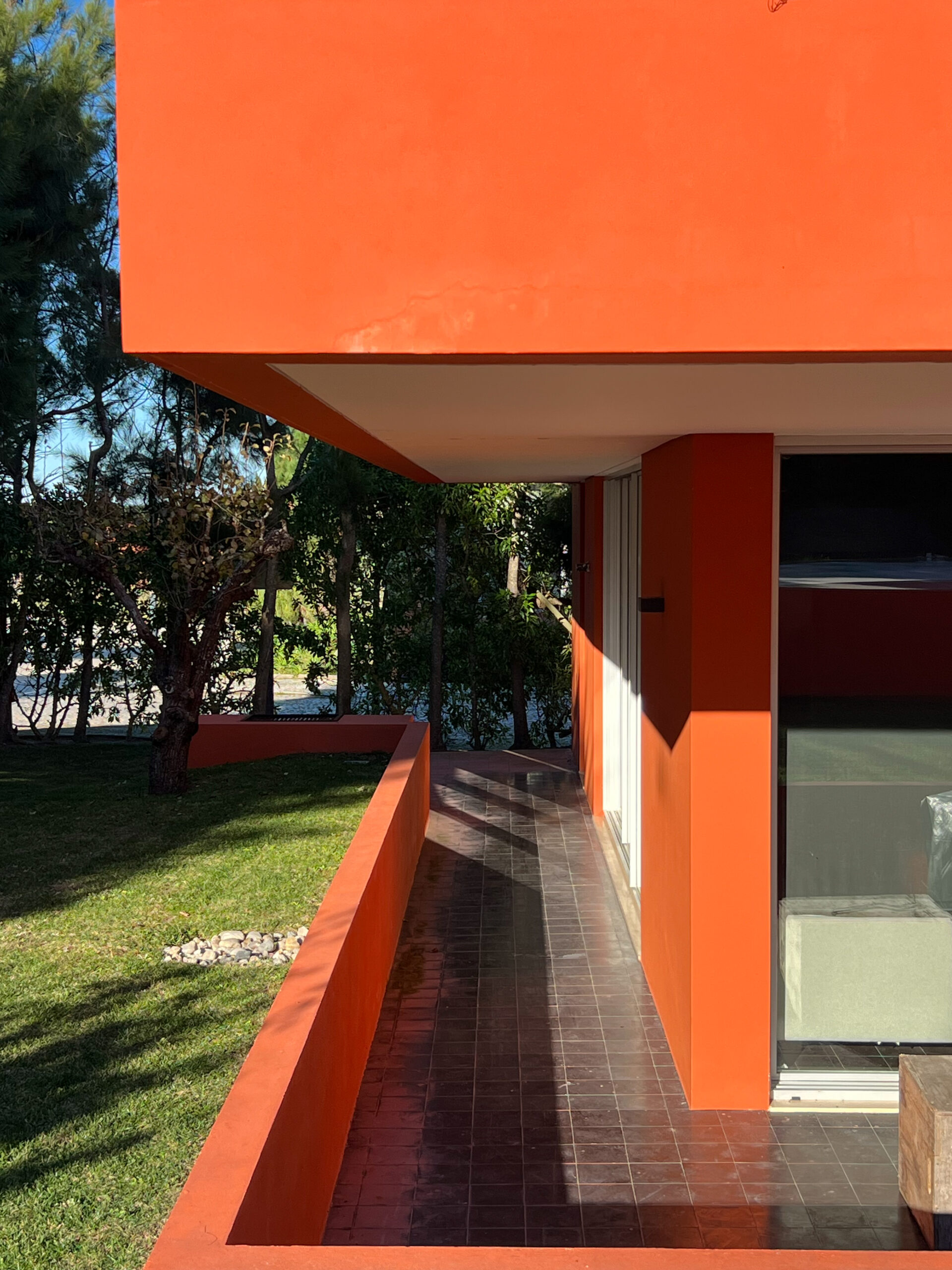 The first volume is positioned against the northern boundary, slightly aligned along the longitudinal axis of the plot. The second volume, set three meters from the adjacent lot’s eastern boundary, extends southward. Entry to the property is from the northeast corner, where an overhang along the eastern façade guides visitors towards the main entrance. A break in the northeastern corner of the house, near the laundry courtyard, provides a secondary access point for service areas, while parking is located at the northeast end of the plot.